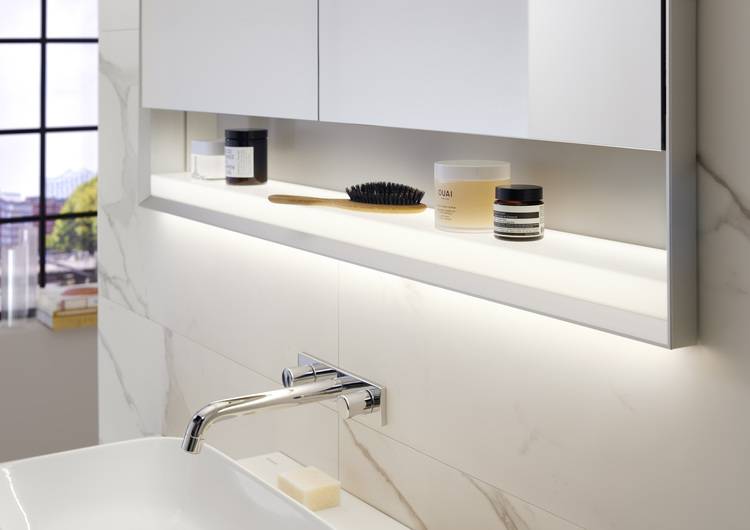 „Das in den Geberit Spiegelschrank integrierte ComfortLight ist so konzipiert, dass es vier verschiedene Lichtquellen für eine optimale Ausleuchtung von Spiegelbild, Waschtisch und Badezimmer nutzt: ein Deckenlicht bzw. indirektes Raumlicht, ein Spiegellicht, ein Nischenlicht und ein Waschtischlicht“, sagt Ramona Häberle, Produktmanagerin Badezimmersysteme von Geberit.