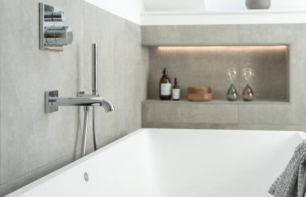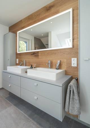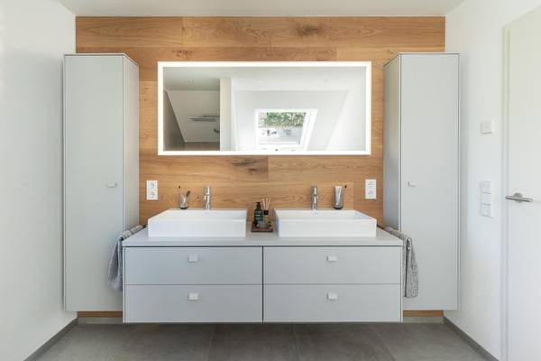 Die Auswahl der Produkte und Materialien erfolgte nach der Devise „zeitlos und qualitativ hochwertig“. Großformatige, graue Fliesen, eine bodenebene Dusche, eine Badewanne aus hochwertigem Mineralguss, weißer Putz, Möbel in hellem Grau, zwei Waschbecken, ein großflächiger Spiegel und als Highlight die Waschtischrückwand aus massiver Eiche.