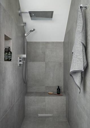 Die Duschzone, früher neben der Tür, wurde auf die gegenüberliegende Seite des Raumes verlegt und profitiert nun vom seitlich einfallenden Tageslicht. In der neu eingezogenen Zwischenwand befinden sich Leitungen und Anschlüsse für die Armaturen. Thermostatmischer, eine große, quadratische Kopfbrause und die Handbrause bieten angenehmen Duschkomfort.