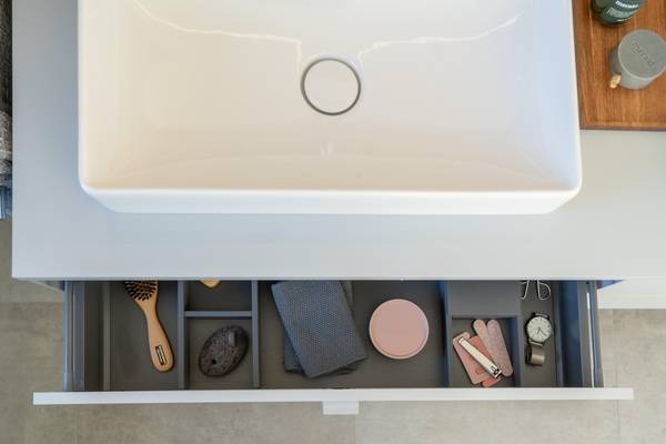 Ein gut funktionierendes Alltagsleben, viel Ablagefläche und Stauraum für eine aufgeräumte Optik – darauf legt das Bauherrenpaar großen Wert. Bei der Planung war deshalb schnell klar: der Waschplatz bleibt an der langen Wand. Mit zwei markant geformten Aufsatzbecken bietet er großzügigen Komfort, der Platz darunter ist mit vier Schubkästen und praktischem Inneneinrichtungssystem perfekt aufgeteilt und organisiert. In den Hochschränken rechts und links liegen Handtücher und Pflegeprodukte griffbereit.