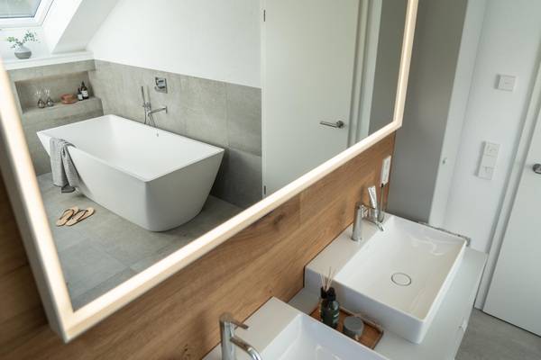 Der extrabreite Spiegel vergrößert den Raum optisch und ist gleichzeitig Teil des Beleuchtungskonzepts. Zusätzlich zu den Einbaustrahlern an der Decke bietet die umlaufende, blendfreie und dimmbare LED-Spiegelbeleuchtung die Möglichkeit, unterschiedliche Lichtstimmungen zu erzeugen.