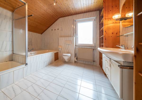Die nötigen Baumaßnahmen für den Badumbau waren: eine Entkernung des Bads, das Entfernen der Holzdecke, ein Dachfenster wurde eingesetzt, sowie eine Duschnische und eine Vorwandinstallation für das WC angefertigt.
