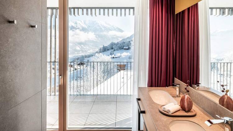 Das Hotel erstreckt sich über vier Ebenen und verfügt über 123 Zimmer und Suiten, die auf den oberen drei Etagen verteilt sind. Weißer Putz, Naturholz sowie eine herbstlich warme Farbpalette vermitteln ein wohliges Raumambiente, während großzügige Panoramafenster das alpine Flair ins Zimmer holen und eine spektakuläre Kulisse schaffen. Dank der offenen Bauweise kann der Ausblick im ganzen Zimmer genossen werden, sogar im Bad.