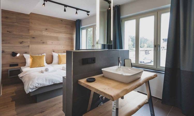 Die 128 kleinen und großen Apartments, die sich in einem historischen Bauwerk direkt an der Ostsee befinden, überzeugen durch ihr exklusives sowie gemütlich gestaltetes Interieur, das an eine moderne Berghütte erinnert.