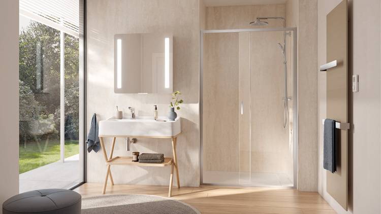 Die Besonderheit der Serie ist der vorgelagerte Drehpunkt der Duschkabinentür, der trotz ungünstiger Raumsituationen funktionale und ansprechende Duschkabinen ermöglicht.