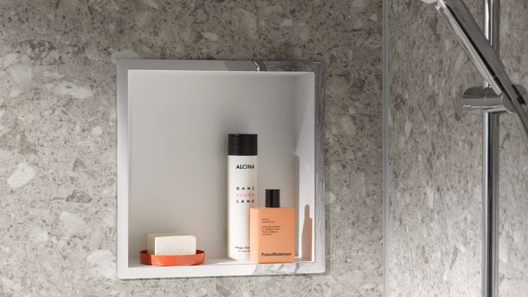 Die Wandeinbaubox sorgt nicht nur für Ordnung im Duschbereich, sie stellt zudem ein optisches Highlight dar. Der Kunde hat hier die Auswahl zwischen einem Rahmen in Chromoptik und in Schwarz-matt. Das Modell in Chromoptik wird in Kombination mit einer zeitlos modernen Rückwand in den Farbvarianten RenoDeco Seidenmatt Uni, Arctic-Weiß oder in Seidenmatt Uni, Aschgrau angeboten.