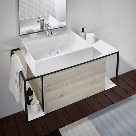 Der Waschtischunterschrank besteht aus einem filigranen Metallrahmen aus schwarz eloxiertem Aluminium mit einem etwas kleiner dimensionierten Schrank. Für die Schrankfront stehen zur Auswahl: Acrylfronten in Weiß und Grau Hochglanz, Melaminfronten in den Dekoren Eiche Cashmere, Eiche Flanelle und Marone Trüffel. Die matt-weiße und weiche Konsolenplatte ist resistent gegen Abrieb, Kratzer und Reiniger. Zudem lassen sich Kratzer durch thermische Behandlung „ausbügeln“.