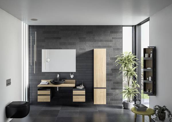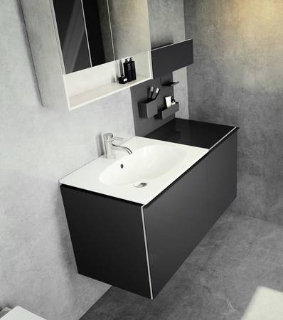 Bei den Badmöbeln sind unterschiedliche Materialien wie Glas, Holzdekor, Metall und Lack miteinander kombiniert. Sie können als reine Waschplatzlösung mit Waschtisch, Waschtisch-Unterschrank und Spiegelschrank oder als Konzeptlösung eingesetzt werden. Besonders variantenreich sind die Hochschränke, z. B. als schmale, raumsparende Variante mit Apothekerauszug. Der Spiegelschrank ist an der inneren Rückseite vollflächig mit einem Spiegel und mit Licht ausgestattet, während beide Flügeltüren über Ablagefächer verfügen. Alle benötigten Dinge sind so immer in Reichweite.