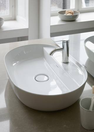 Ovale Aufsatzschalen aus DuraCeram weisen feine Linien, ein großzügiges Innenbecken und klare Kanten auf. Optional können seidenmatt glasierte Außenflächen in Weiß, Grau oder Sand gewählt werden. Die Basis für den Waschplatz bilden Konsolentische. Seidenmatt lackiert in sechs verschiedenen Farbtönen prägen sie das Raumgefühl. Konsolenplatten aus Quarzstein in drei Farbvarianten sowie eine Massivholzausführung werden je nach Wunsch kombiniert. Luv bietet außerdem prägnant geformte Badewannen aus DuraSolid A.