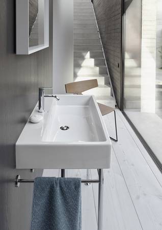 Zum Hingucker im Bad werden die Becken in Kombination mit dem neuen Möbelaccessoire. Dieser flexible Unterbau ist höhenverstellbar und in Silber (Chrom) oder Schwarz matt erhältlich. Ein Glaseinleger im Möbelaccessoire, der in sechs verschiedenen Farben angeboten wird, bringt Farbtupfer ins Bad und ist mit allen Möbelprogrammen von Duravit kombinierbar.