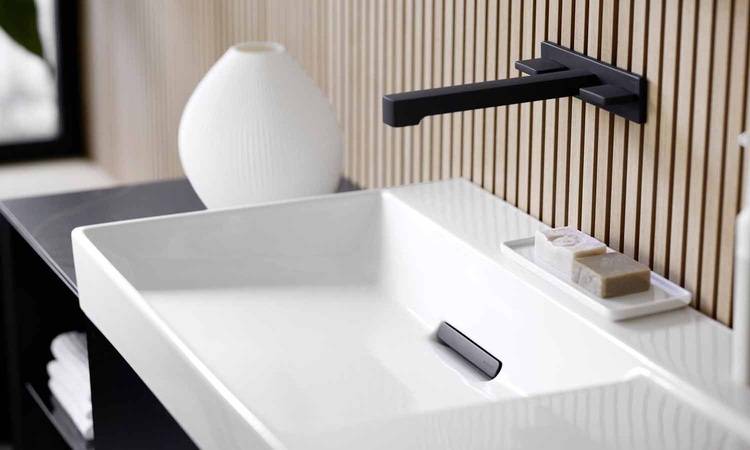 Auch der horizontale Ablauf des Geberit One Waschtischs erhält ein Farbupdate: Ab April 2023 gibt es ihn, zusätzlich zu den Farbvarianten Weiß, Hochglanz verchromt und Chrom gebürstet, auch in Schwarz matt. Der Kontrast mit der weißen Keramik sorgt für eine ästhetisch ansprechende Optik.