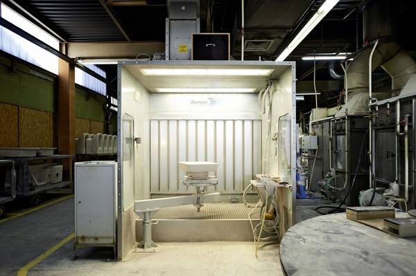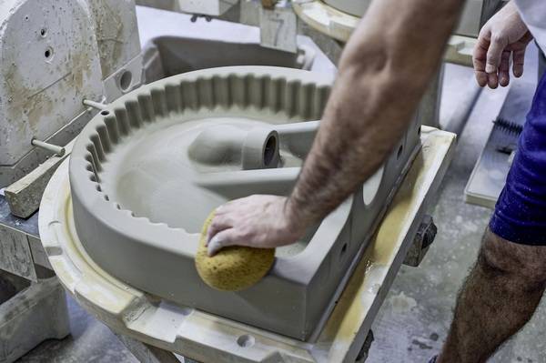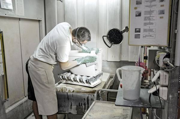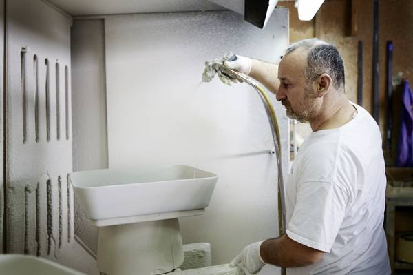 Sanitärkeramik besteht aus dem sogenannten Scherben, der mit einer Glasur überzogen und im Ofen bei hohen Temperaturen von etwa 1280°C gebrannt wird. Daraus resultiert ein hoher Härtegrad, der ihr selbst in öffentlichen Sanitäranlagen eine hohe Lebensdauer beschert. Die hygienisch glatte Glasur macht ihre Oberfläche abrieb- und kratzfest sowie pflegeleicht. Quarz, Kreide und Feldspat werden für die Glasur miteinander vermischt, und mithilfe einer Druckluft-betriebenen Sprühpistole von Hand oder durch automatische Spritzanlagen in einer Dicke von 0,8 bis 1 m auf das ungebrannte Sanitärstück aufgetragen.