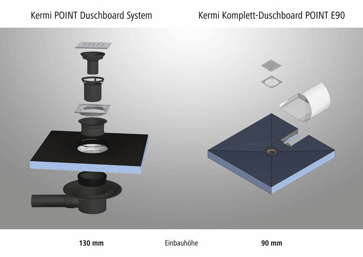 Eine extraflache Lösung für den Renovierungsbereich bietet Kermi mit den Komplett-Duschboards POINT E65, LINE E70 und dem POINT E90 - drei extraflache befliesbare Duschboards mit integriertem Punkt- bzw. Rinnenablauf mit nur 65, 70 oder 90 mm Einbauhöhe. Die Besonderheit ist der bereits werksseitig eingedichtete Ablauf. Das bedeutet kürzere Montagezeiten und eine einfachere Installation für den Fachhandwerker.