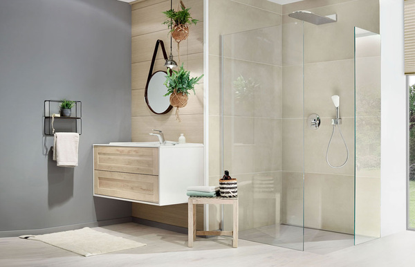 Kermi lässt die Duschkabine "verschwinden". Im konkreten Fall wurde eine Walk-In XC mit 10 mm Einscheiben-Sicherheitsglas mit einer Tusca-Spezialanfertigung über KermiEXTRA zur glasbündigen Montage an Kante kombiniert.