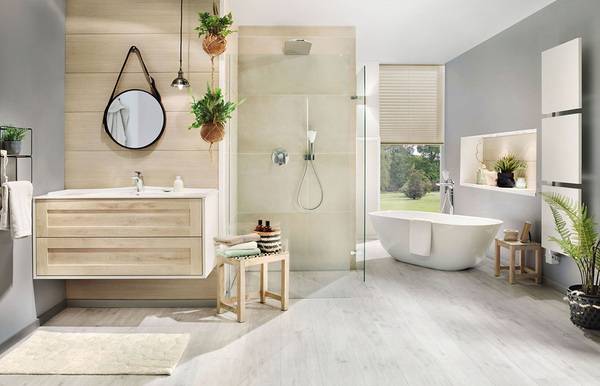 Der bodenebene Duschplatz von Kermi fügt sich ebenso nahtlos in den Raum ein. Keine Wanne hebt sich vom restlichen Boden ab. Stattdessen wurde das Duschboard Line XXL im Boden versenkt und mit den gleichen Fliesen wie im restlichen Badezimmer belegt. Das Board ist zudem individuell einsetzbar, denn es lässt sich flexibel zuschneiden.