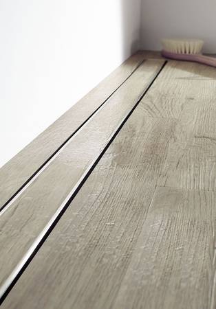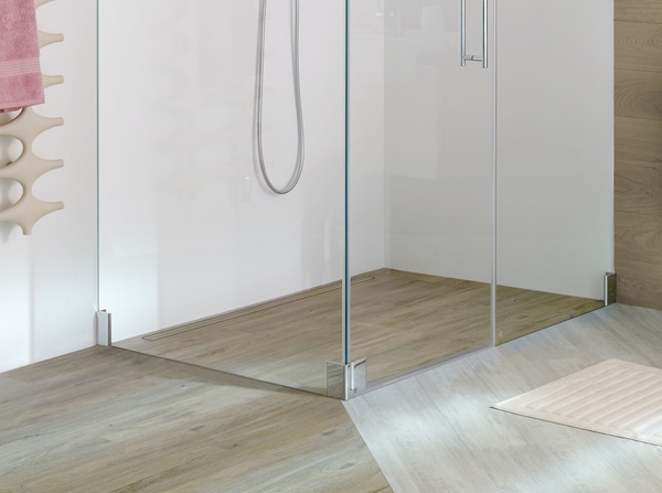 Das einseitige Gefälle des Boards endet mit einer schlanken, eleganten Rinnenabdeckung mit einer Breite von 1100 mm bzw. 700 mm, erhältlich in den Designausführungen Basic, Exklusiv oder Verfliesbar.