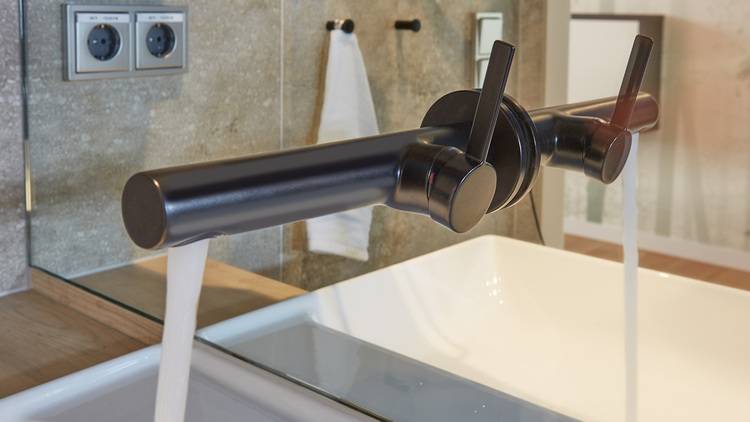 Neben Privatversicherten und gesetzlich versicherten Patientinnen und Patienten mit einer privaten Zusatzversicherung, stehen die Zimmer der Wahlleistungsstation auch Selbstzahlern zur Verfügung. Der Look der Designwelt in den Zimmern setzt sich in den Badezimmern fort. Ein Mix aus gedeckten Tönen und akzentuierenden Farben. Die schwarz matten Badausstattungen von Keuco sorgen für einen sichtbaren Kontrast. Die spezielle Lack-Beschichtung macht sie unempfindlich, haltbar und pflegeleicht.