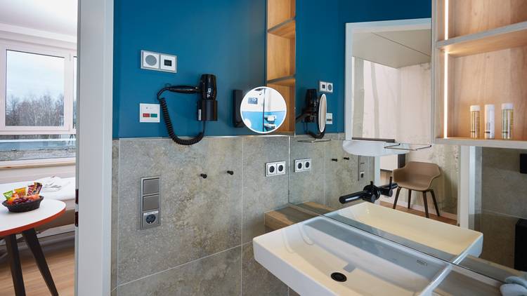 In der Dusche assistiert der Axess Haltegriff, der gleichzeitig zum Trocknen des Handtuchs genutzt werden kann. Eine einfache Handhabung verspricht der Ixmo_solo Einhebelmischer in Verbindung mit der höhenverstellbaren Handbrause an der Duschstange. Alle Duschutensilien finden in der großzügigen Duschablage ihren Platz. Am Waschtisch sorgt die Ixmo Wandauslaufarmatur für ein durchgängiges Bild. Mit der Armatur als Wandmodell ist der Waschtisch für das Personal außerdem einfacher zu reinigen.