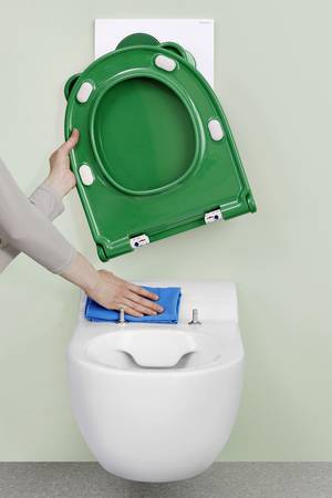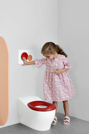 Rimfree-Keramiken verbessern die Hygiene und erleichtern die Reinigung. Für mehr Sauberkeit und Reinigungsfreundlichkeit sorgen Sitze, die sich nach oben abnehmen lassen. Diese QuickRelease-Funktion sollte verriegelbar sein, damit die Kinder die Sitze nicht selbstständig abziehen können. Sind WC-Kabinen geplant, müssen diese genügend Platz bieten, damit Erziehende die Kinder beim WC-Gang unterstützen können.