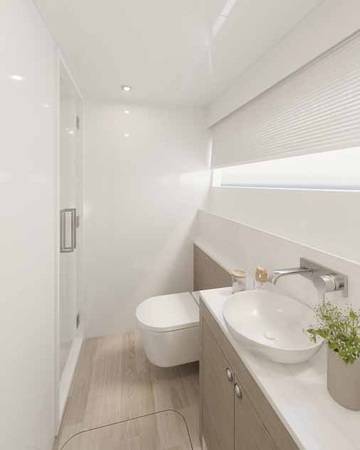 „Wir glauben, dass Nachhaltigkeit in Bezug auf Yachting über den solarelektrischen Antriebsstrang hinausgeht", sagt Designerin Juliana Miguel, die bei Silent-Yachts die kreative Leitung innehat. "Und wir wissen, dass es einen ganzheitlichen Ansatz in allen Bereichen benötigt, damit unsere Leidenschaft wirklich Hand in Hand mit der Natur funktioniert. Aus diesem Grund stützen wir unseren Ansatz auf drei Säulen: Design, Material und Betriebe“. Miguels Design-Team ist begeistert von Stahl-Emaille und den modernen Kaldewei-Waschtischen.