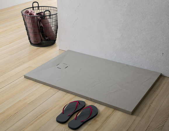 Calce, das neue Duschwannensortiment, ist aus dem Werkstoff MineraLite, einem Verbundmaterial aus Mineralien und Harzen, das hohe Leistungen mit einer natürlichen Optik verbindet. Hiermit gelingt Glass 1989 eine ganz neue Oberflächenbeschaffenheit in Zementspachteloptik, die der Duschwanne ein materisches Aussehen verleiht.