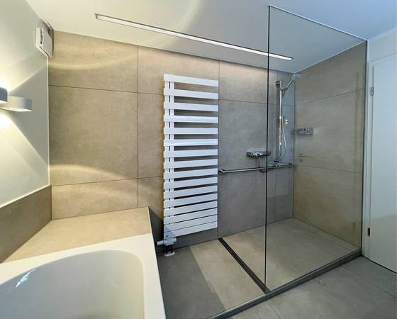 Die Position der Duschrinne war zu Beginn des Umbaus leider nicht genau zu bestimmen. Der vorhandene Bodenablauf im Bestand ließ auf die Möglichkeit hoffen, die Duschzone eventuell auch bodenbündig ausführen zu können. Bei genauerem Hinsehen stellte sich leider heraus, dass der schon lange nicht mehr nutzbar war und auch wieder nicht aktiviert werden konnte. Der bisherige Wannenablauf allerdings ermöglicht es, die Rinne am offenen Ende der Glaswand zu verbauen und mit einem beiderseitigen Gefälleestrich die Einstiegshöhe auf ein Minimum von wenigen Zentimetern zu reduzieren.