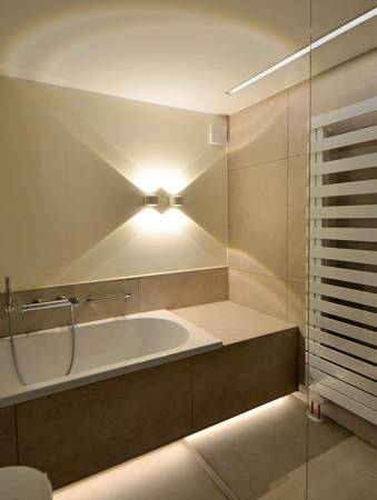 Der Grundriss des Badezimmers ist annähernd quadratisch. Dem folgt die Raumgestaltung, in der die Badelandschaft die Frontseite und die Duschzone die gesamte rechte Seite einnimmt. Die Acrylwanne im Format 180 x 80 cm wird hinter der Vorwandschale eingeschoben und auf der rechten Seite durch ein verfliestes Podest verlängert. Die Ablage betont die Gestaltung optisch. Über der gesamten Breite sorgt ein LED-Nachtlicht im Untertritt für einen atmosphärischen Lichteffekt, es lässt die gesamte Anlage optisch schweben. Zwei Wandleuchten mit Up-down-Lichtreflexion vollenden den Badebereich.