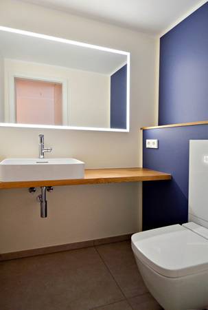 Geometrisch schlicht schmiegt sich die filigrane Corianplatte an die Farbwand. Sie wird ergänzt durch einen mattweiß lackierten, angepassten Unterschrank. Die Ablagefläche auf der linken Seite ist praktisch in der täglichen Nutzung und verlagert die Bewegungsfläche so, dass sie außerhalb des Türöffnungsbereiches liegt. Hinter dem Badmöbel versteckt hängt das schlichte Wand-WC an einer weißen Glasplatte mit Sensorelektronik. Technische und optische Gründe überzeugten die Bauherren ebenso wie die integrierte Geruchsabsaugung.