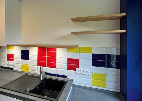 In der Küche wird der verflieste Küchenspiegel selbst zum Kunstobjekt – mit den Metrofliesen in klaren Grundfarben wird die Idee des Künstlers Mondrian interpretiert. Hierzu haben sich die Bauherren selbst in einem Puzzlespiel eingebracht. Die dunkelblaue Kopfwand ist farblich darauf abgestimmt und zieht den Blick schon aus dem Flurbereich magisch an.