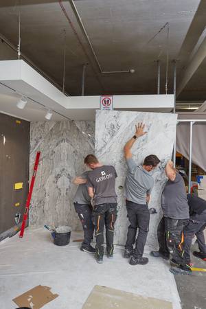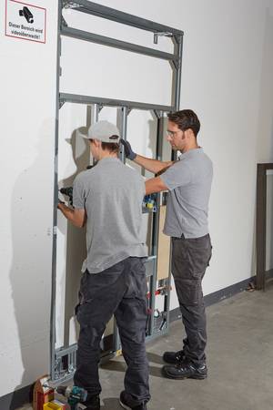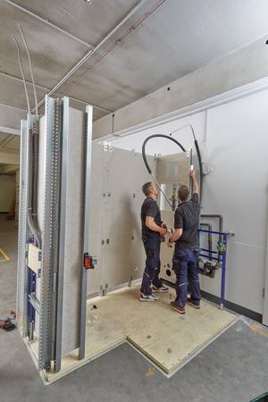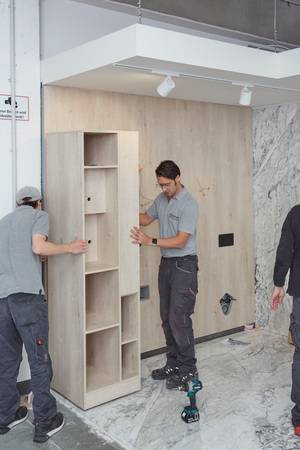 Beim zweiten Keuco Expertenforum in Hemer konnten sich die Teilnehmerinnen und Teilnehmer davon überzeugen, wie zwei unterschiedliche Systeme modularer Badlösungen, auf höchstem ästhetischem und technischem Niveau, in kürzester Zeit parallel zu den Vorträgen aufgebaut wurden.