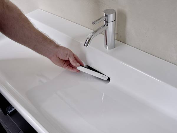 Die Besonderheit des vertikalen Ablaufs liegt darin, dass nicht nur mehr Stauraum geschaffen wird, der keramische Deckel des Ablaufs fügt sich zudem bündig in die Geometrie des Waschtisches ein – für ein harmonisches Gesamtbild.