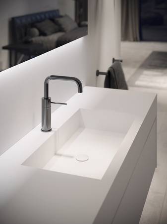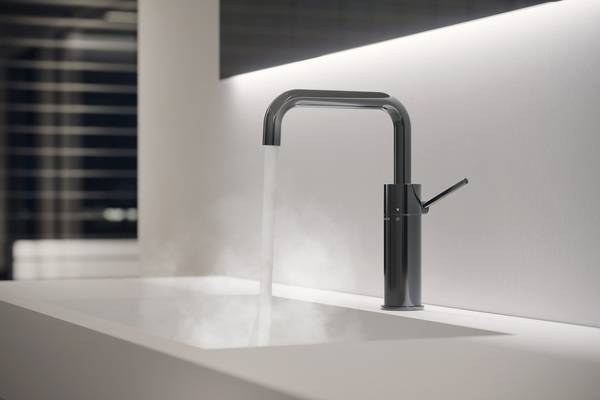 Diese Lösung spart außerdem Wasser und Energie, da die Armatur im Kaltwasserbetrieb geöffnet werden kann, um ein unnötiges Anlaufen der Heißwasserzufuhr zu vermeiden. Zudem begrenzt der im Auslauf verborgene Luftsprudler den Verbrauch auf nur 5 l/min und das bei einem gleichermaßen vollen und angenehmen Wasserstrahl.