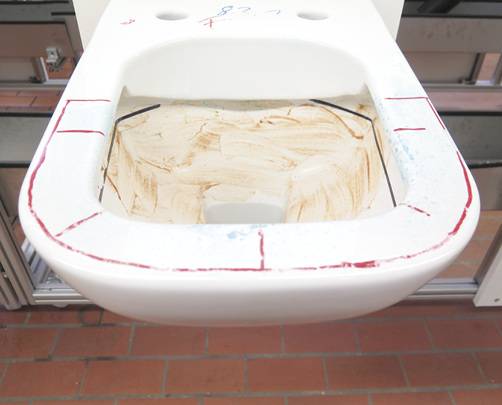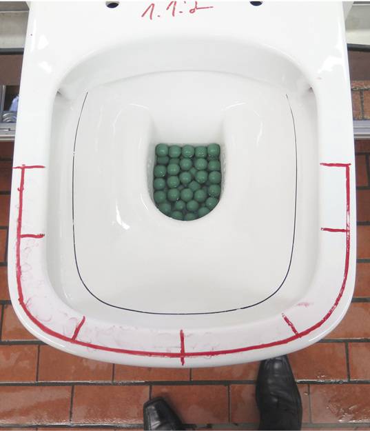 Um das Ausspülverhalten der spülrandlosen WCs zu testen und zu dokumentieren wurde die Prüfung mit 20 g trockenem, feinkörnigem Holzsägemehl durchgeführt. Dieses wurde auf die zuvor befeuchtete Beckeninnenseite gleichmäßig gestreut. Bei Prüfung der Flächenspülung von WC-Becken ohne Spülrand wurde der arithmetische Mittelwert aus fünf Prüfungen der unbespülten Fläche im Bereich zwischen der Wasserfläche im Geruchsverschluss und einer horizontalen Linie 85 mm unter der Oberkante der Beckenmulde bestimmt. Diese Fläche darf 50 cm2 nicht überschreiten.