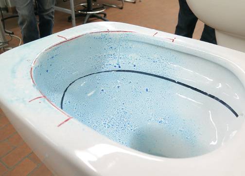 Im hinteren Bereich des Beckens anhaftende Fäkalien sind der Freund einer jeden Klobürste. Deshalb ist sauberes Ausspülen hier besonders wichtig. Beim Schmiertest, der die Fäkalanhaftungen simuliert, wurde die hintere Hälfte der Innenseite unterhalb der Spülwasseraustrittsöffnungen gleichmäßig mit Ketchup bepinselt. Unmittelbar nach Aufbringen des Belags wurde gespült.
