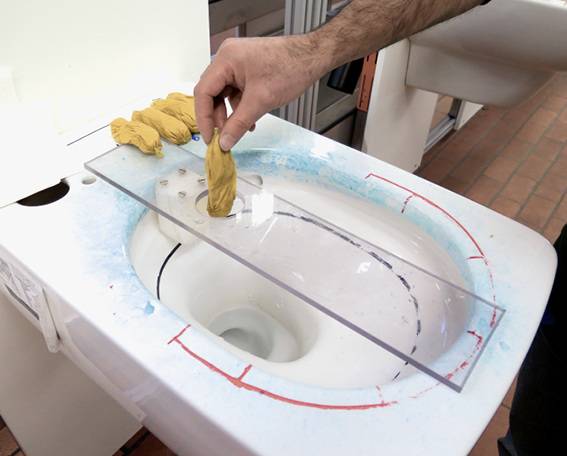 Während es in der vorderen Hälfte des WC-Beckens zu Verunreinigung der Beckeninnenseite durch Urinspritzer kommen kann, sind im hinteren Bereich des Beckens eher Fäkalanhaftungen der Grund für Verunreinigungen. Um diesen Gegebenheiten Rechnung zu tragen, wurde das WC-Becken durch Markierungen in eine vordere und eine hintere Hälfte eingeteilt. In der vorderen Hälfte wurde der gesamte unbespülte Spülrand gemessen (Spülrandtest). Im hinteren Teil des Beckens wurde die unbespülte Fläche unterhalb der Spülwassereintrittsöffnungen gemessen (Schmiertest).