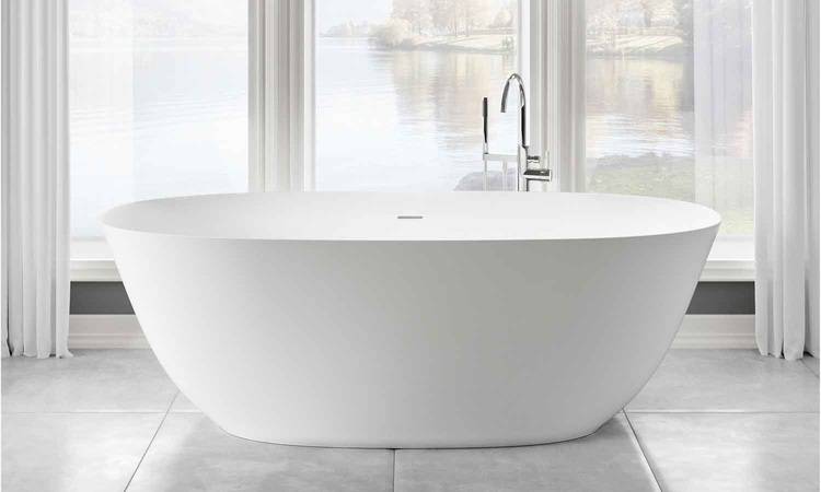 Der Mineralwerkstoff ermöglichst filigrane Wände der freistehenden Badewanne.