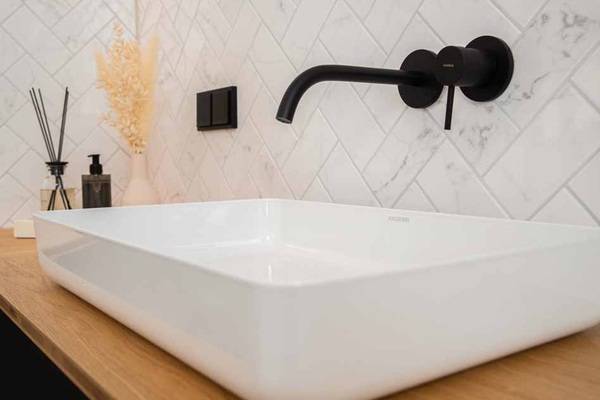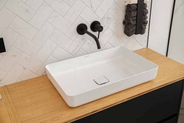 Für ihr neues Traumbad hat Sandra sich für den eckigen Waschtisch Miena mit seinem filigranen Randverlauf und die luxuriöse Wellness-Badewanne Conoduo entschieden. Beide hat sie in Eigenleistung verbaut und montiert – zwischen Modeljobs und Kundenbaustellen.