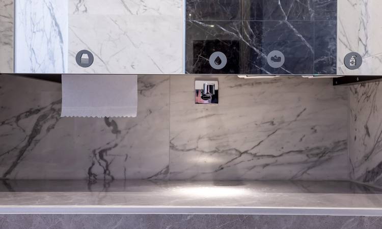 Neben der Widerstandsfähigkeit bei hoher Dauerbelastung, Ersatzteilsicherheit, Wartungsfreundlichkeit und einem guten Support des Herstellers war vor allem die berührungslose Bedienung entscheidend. Die WCs verfügen über eine berührungslose Spülung und eine integrierte Geruchsabsaugung. Als Betätigungsplatte wurde das Modell Sigma80 von Geberit eingebaut. Dank der schlichten schwarzen Glaskeramikoberfläche fügt sich die Platte elegant in das moderne Gesamtbild ein.
