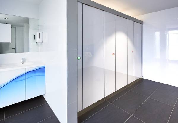 Die WC-Trennwand ist feuchtraumgeeignet und besteht aus 36mm starken Sandwichelementen mit innenliegendem Aluminiumrahmen und einer beidseitigen, drei Millimeter starken HPL-Oberfläche. Die nach hinten versetzten Stützfüße lassen die Anlage optisch schweben und ermöglichen in Kombination mit einer flächenbündigen Front eine einfache Reinigung.