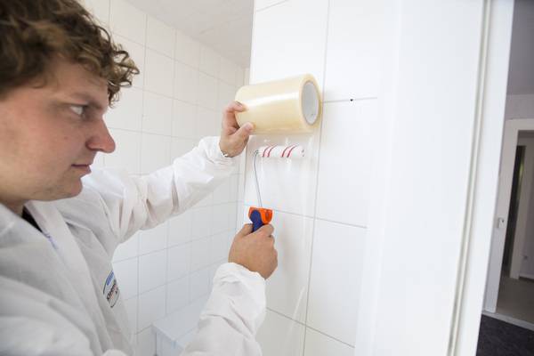 Wenn die Walze auf dem Walzenstab steckt, nutzt Martin Bunz ein extra Klebeband (etwa 10 cm) und fährt mit der Walze einige Male über die klebrige Seite. „So entferne ich Staub, lose Fasern und Fusseln, die später nicht in GriP AntiRutsch landen sollen. Diesen Tipp hat mir der Hersteller einmal gezeigt, das beherzige ich seither.“ Auch zieht der Fachmann jetzt einen Malerkittel oder weißen Schutzanzug über, damit von der farbigen Arbeitskleidung nichts auf die Oberfläche übertragen wird.