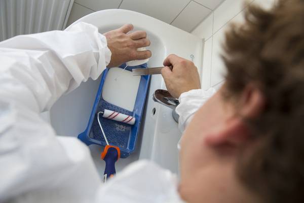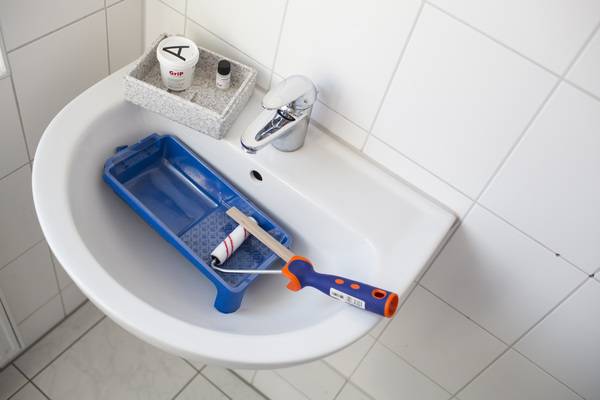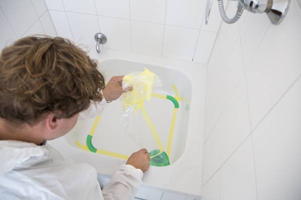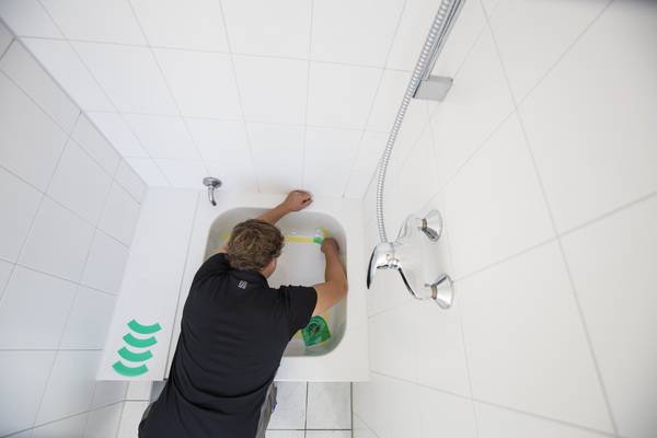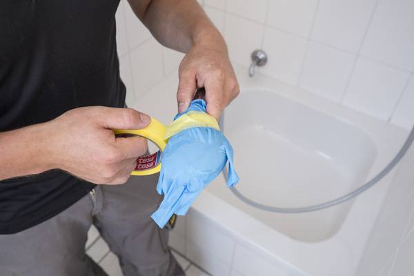 „Ich reinige die Wanne oder Duschwanne mit Spiritus und einem Textil-Tuch. Das ist zwar keine explizite Vorgabe vom Hersteller, doch so kann ich Klebereste von der Verpackung oder Aufklebern gut entfernen und prüfen, ob die Oberfläche irgendwo verkratzt ist oder Farbeinschlüsse hat.“ Da die neue Oberflächenbeschichtung mit keinerlei Wasser in Berührung kommen darf, werden die Armaturen präpariert: „Ich ziehe einen Gummihandschuh über die Handbrause oder befestige eine Tüte über dem Ablauf und dichte alles mit Klebeband ab.“