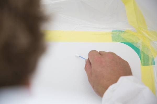 „Beim Auftragen beachten, dass am besten aus zwei Richtungen gewalzt wird. Dann nochmals genau prüfen, ob winzige Fussel hängen geblieben sind – falls ja, diese mit Ohrenstäbchen heraus heben. Am Ende noch einmal ein Finish walzen, also insgesamt etwa drei Mal die Fläche beschichten.“