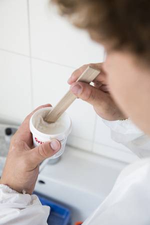 GriP AntiRutsch ist eine körnige, wasserbasierte Zwei-Komponenten Beschichtung. Nun werden die Materialien zusammen geführt. Gebinde A ist die Grip-Mischung. „Ich öffne den Becher und rühre mit dem Holzstäbchen die Masse um. Die Konsistenz fühlt sich an wie Lack mit Sandpartikeln. Je besser ich aufmische, desto leichter tue ich mich beim Auftragen.“ Anschließend wird der Härter (Flüssigkeit B) eingerührt.