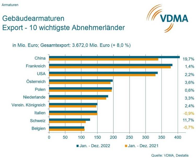 internationalen Wettbewerb konnten sich die deutschen Hersteller von Gebäudearmaturen 2022 gut behaupten. Das Exportgeschäft, das sich bereits 2021 rasch vom Corona bedingten Rückgang erholt hatte, konnte 2022 weiter expandieren. Der deutsche Export von Gebäudearmaturen stieg um 8,0 Prozent auf insgesamt 3,7 Milliarden Euro. Die Liste der Top 10-Absatzländer wurde – anders als in den Vorjahren – von China angeführt. Trotz der Lockdowns und der zunehmend trüberen Perspektiven für die Bauwirtschaft in der Volksrepublik kletterten die deutschen Exporte nach China um 19,7 Prozent auf 406,1 Millionen Euro. Frankreich fiel dagegen mit nur einem geringen Plus von 1,4 Prozent auf 383,3 Millionen Euro auf Platz zwei zurück. Auf Rang drei platzierten sich erneut die USA. Die Exporte in die USA nahmen um 2,2 Prozent auf 337,8 Millionen Euro zu.