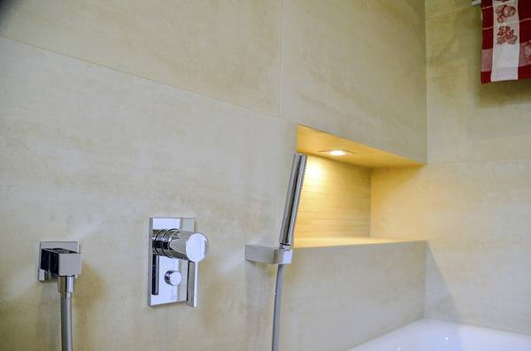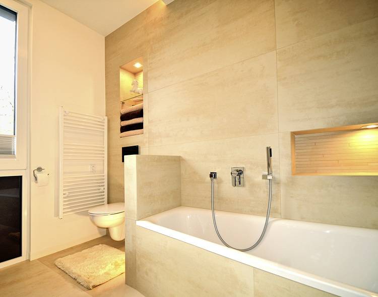 In der Dusche sorgt eine beleuchtete Shampoo-Nische dafür, dass die Kosmetik am richtigen Platz zur Verfügung steht. Wird hierfür nichts vorgesehen, stehen die Flaschen zumeist auf dem Boden herum oder man muss mit einem vor der Wand hängenden Korb vorlieb nehmen – und davon gibt es nicht viele wirklich schöne Modelle. Diese Nische kann zum Beispiel mit dem gegenüberliegenden WC-Bereich gespiegelt sein. In Breite und Ausführung identisch, vermittelt dieses Detail ein schönes Ambiente im Bad.