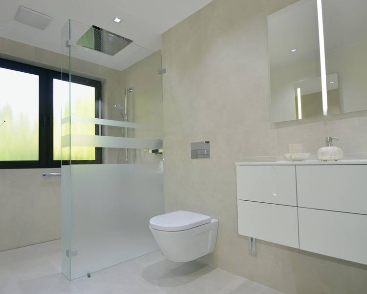 Das trifft ebenso auf das Thema Duschabtrennung zu. Die räumliche Großzügigkeit der Komfortbäder ermöglicht es meistens, eine komfortable, offene Walk-In-Lösung zu integrieren. Zumeist sind das angefertigte Glasscheiben in gerader oder auch gerundeter Form oder mit einem kleinen Frontteil über Eck – das erübrigt die sonst notwendige Haltestange im oberen Bereich. Sehr komfortabel ist die Dekoration des Glases mit einem sinnvollen Siebdruck. Im unteren Bereich vollflächig bedruckt und darüber mit zwei Streifen dekoriert, sieht es hübsch aus und ersetzt die tägliche Reinigung der Glasflächen. Nach dem Duschen verbleiben einzelne Wassertropfen auf der Glasfläche, die dann später zu weißen Rückständen führen. Um das zu verhindern, wird meistens von allen Badnutzern verlangt, nach dem Duschen die große Glasfläche abzuwischen. Für den einen ist das Frühsport – für den anderen ist das lästig. Wer es nicht mag, wählt eine Glasgestaltung, an der die unten vorkommenden Wasserflecken nicht mehr sichtbar sind und bei der Grundreinigung des Bades mit weggewischt werden. Auch das ist täglicher Komfort.