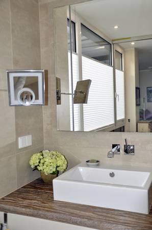 Weiterer Stauraum befindet sich im Spiegelschrank. Die wenigsten Konsumenten von heute möchten eine „Kiste auf der Wand“ haben. Aber Stauraum ist nötig um ein aufgeräumtes, pflegeleichtes und ordentliches Badambiente zu ermöglichen. Die Lösung ist ein in der Wand integrierter Spiegelschrank. In diesem Fall vom Schreiner angefertigt, strahlt er mit LED-Leuchtbändern nach oben und unten und spiegelt das indirekte Licht unter dem Waschtischunterschrank. Eine blendfreie und komfortable Sicht zur Kosmetik wird über den beleuchteten Kosmetikspiegel gewährleistet, der leicht erreichbar im Bereich des Waschtisches angebracht ist.