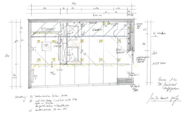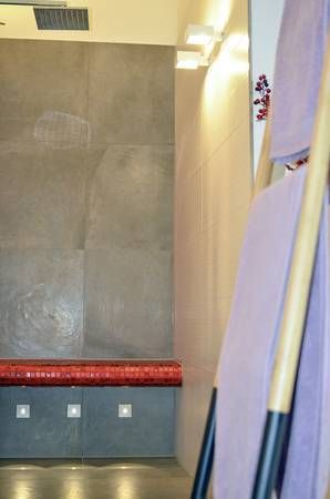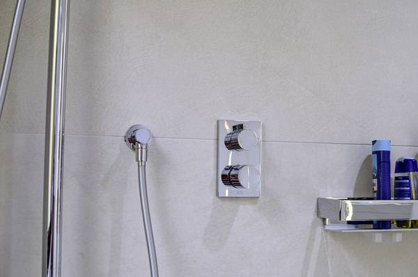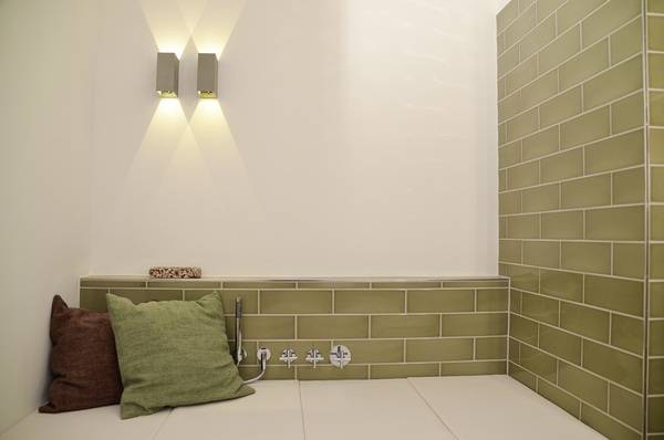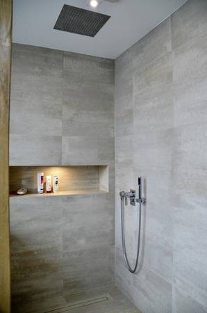 Im angesprochenen Projekt ist eine Duschrinne vom Fliesenhersteller Mosa eingesetzt worden – optisch angepasst. Neben der üblichen Handbrause sorgt auch eine Kopfbrause für erfrischendes Duschvergnügen. Die Besonderheit besteht darin, dass die Kopfbrause bündig in die Decke eingelassen wurde. Technisch bedingt musste sowieso eine abgehängte Decke vorgesehen werden. Kurzerhand wird sie auch zum Einbau des flächenbündigen Brauseregenmoduls genutzt, für den Einbau von Deckenspots und auch ein Ventilator findet darin seinen Platz.