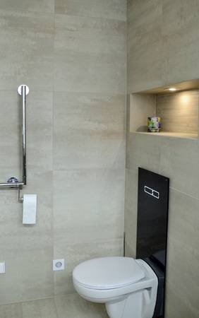 Schon jetzt ist neben dem WC an der Wand ein Griff angebracht worden, der eine sinnvolle Halte-und Stützfunktion anbietet, aber auch zusätzlich als Papierhalter funktioniert. Durch diese Doppelfunktion tritt die „Unterstützungsfunktion“ in den Hintergrund.