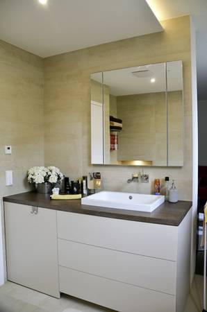 Beides wird in den Wohnungen in Bensberg durch einen wandgebundenen Aufsatzwaschtisch auf einer Konsolenplatte erreicht. Der Porzellanwaschtisch bietet ausreichend Innenraum. Die optisch zu der kubischen Formensprache passende Wand-Waschtischbatterie spendet einen breiten, weichen Wasserfluss und ist zudem pflegeleicht. Die vom Schreiner angepasste Konsolenplatte sorgt für ausreichend Abstellfläche und der ebenso angepasste Unterschrank bietet neben Stauraum für größere Dinge auch Stromquellen für Ladegeräte und ähnliches.